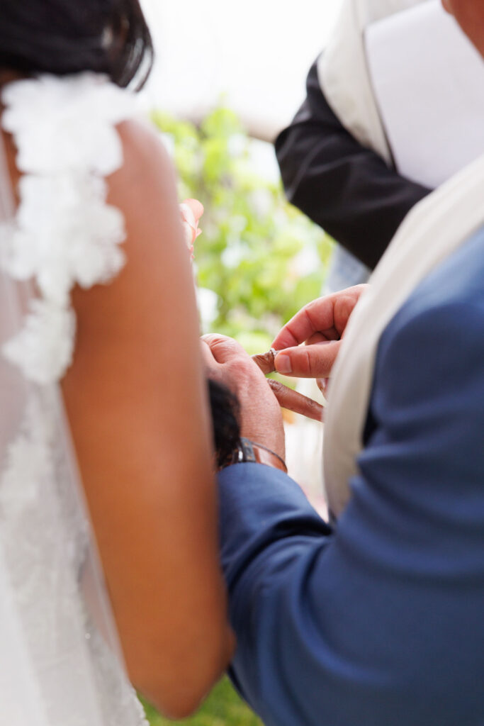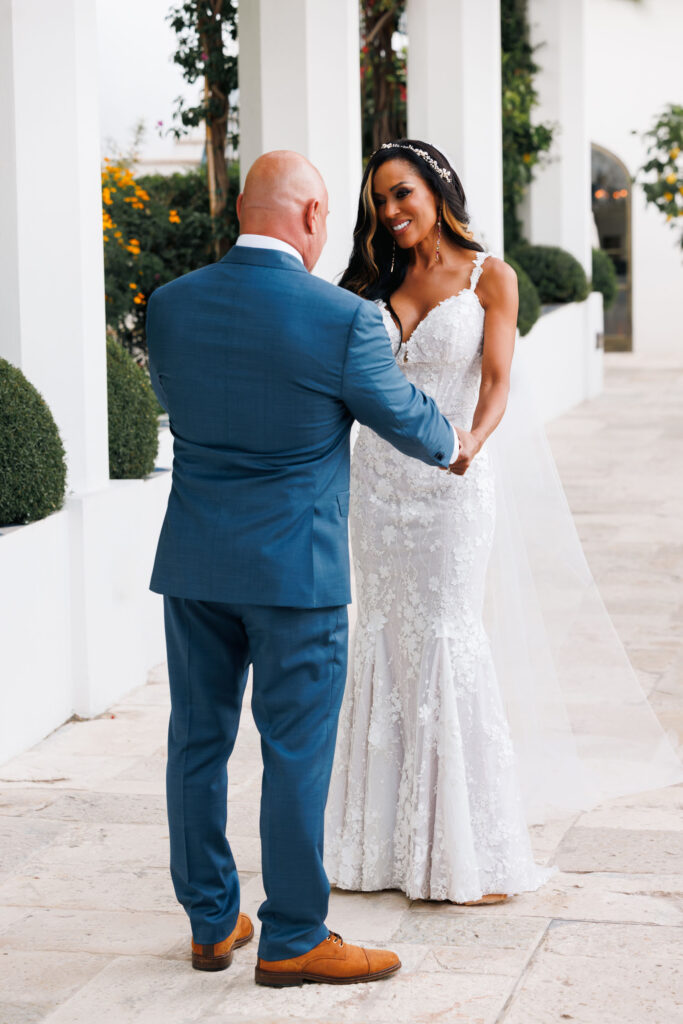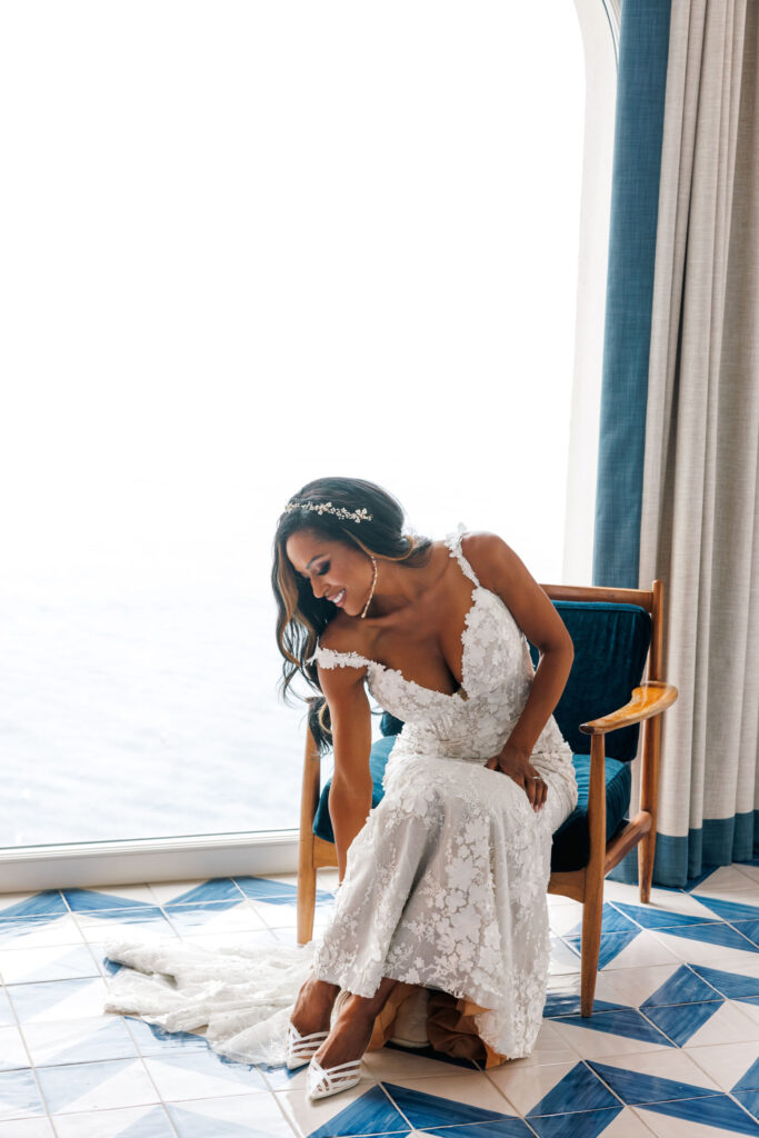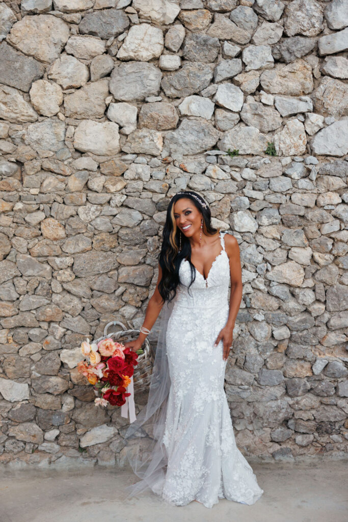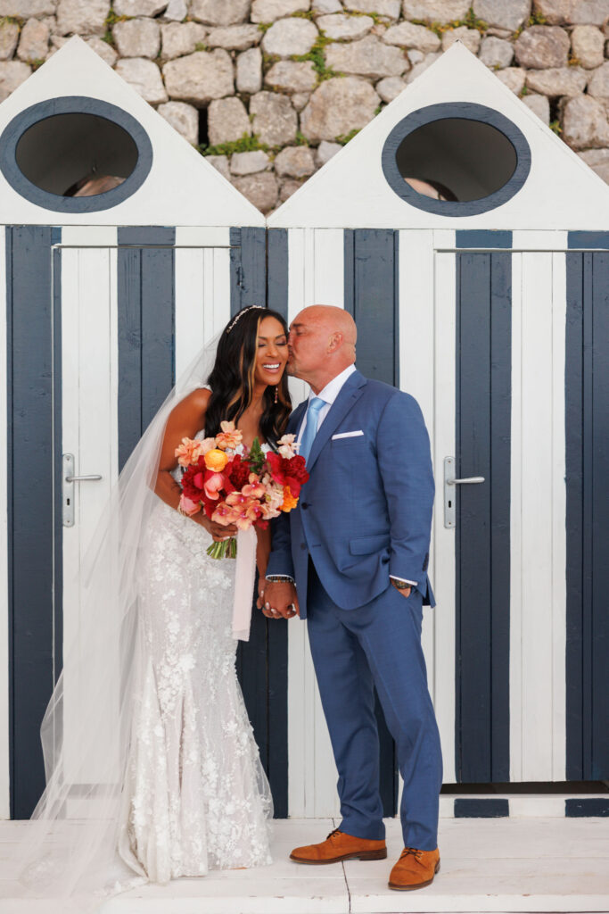 Rosie looked stunning in her shoes from designer She Is Cheval and dress from designer Hayley Paige. Jay wore a suit from close friend and NFL colleague Michael Strahan, perfect for the backdrop of the ocean.